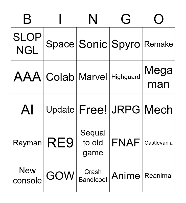 This bingo card has a free space and 24 words: RE9, GOW, Marvel, New console, Remake, SLOP NGL, AAA, Space, JRPG, Sequal to old game, Highguard, AI, FNAF, Castlevania, Colab, Anime, Mech, Sonic, Mega man, Update, Reanimal, Rayman, Spyro and Crash Bandicoot.