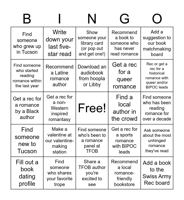 This bingo card has a free space and 24 words: Make a valentine at our valentine-making station, Find someone who shares your favorite trope, Download an audiobook from hoopla or Libby, Fill out a book dating profile, Add a suggestion to our book matchmaking board, Find someone who grew up in Tucson, Find someone who started reading romance within the last year, Write down your last five-star read, Find a local author in the crowd, Find someone who's been to a romance panel at TFOB, Get a rec for a queer romance, Get a rec for a romance by a Black author, Get a rec for a sports romance with BIPOC leads, Ask someone about the most unhinged romance they've read, Recommend a Latine romance author, Recommend a local romance-friendly bookstore, Find someone who has been reading romance for over a decade, Show someone your library card (or pop out and get one!), Rec or get a rec for a historical romance with queer and/or BIPOC leads, Get a rec for a non-Western inspired romantasy, Add a book to the Swiss Army Rec board, Find someone new to Tucson, Recommend a book to someone who has never read romance and Share a TFOB author you're excited to see.