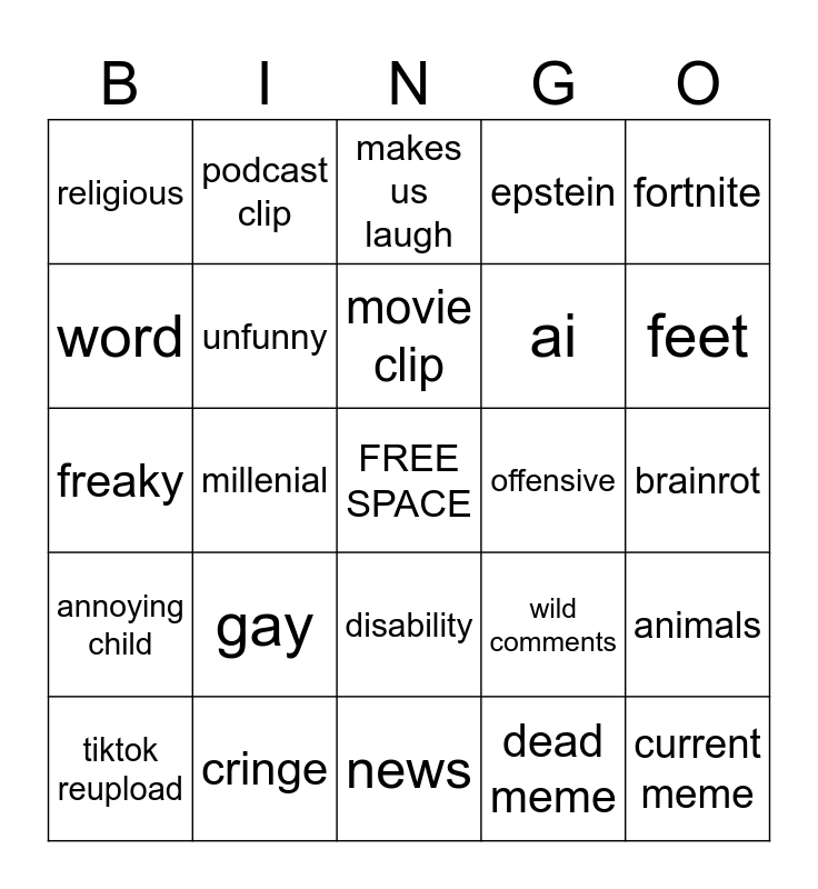 This bingo card has a free space and 24 words: gay, cringe, movie clip, tiktok reupload, fortnite, religious, word, podcast clip, offensive, disability, ai, freaky, wild comments, animals, unfunny, dead meme, brainrot, makes us laugh, feet, millenial, current meme, annoying child, epstein and news.