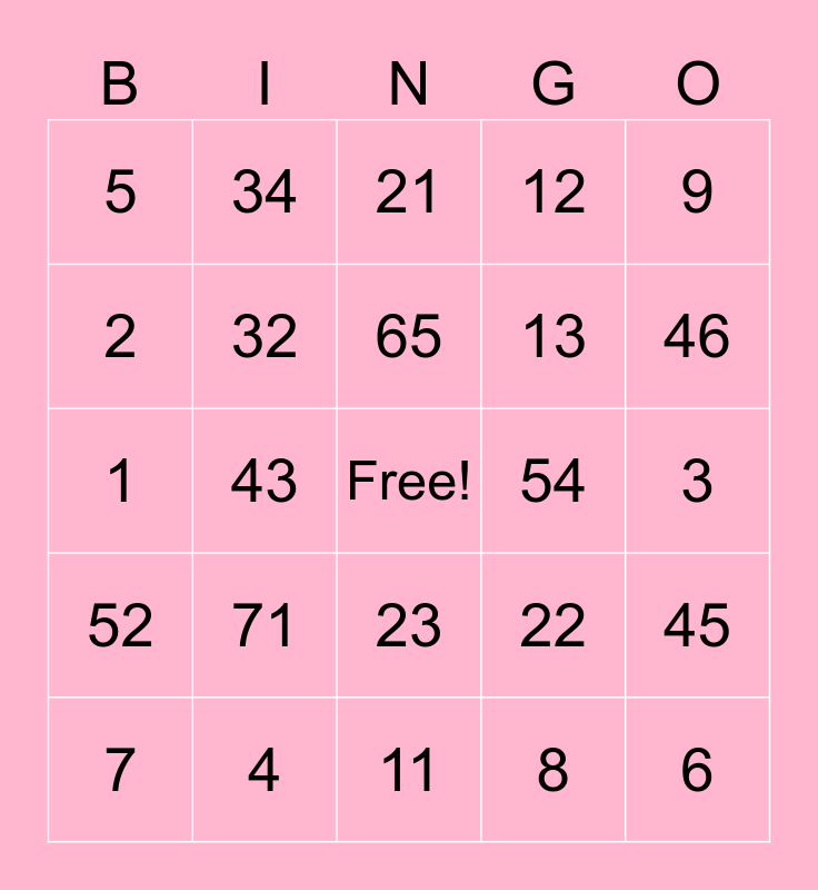 This bingo card has a free space and 24 words: 71, 4, 65, 7, 9, 5, 2, 34, 54, 23, 13, 1, 22, 45, 32, 8, 3, 21, 46, 43, 6, 52, 12 and 11.