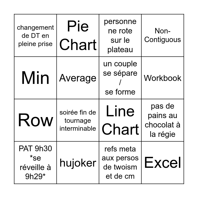 This bingo card has 30 words: "bah euh", dispute prod real, pas de pains au chocolat à la régie, evan fait du evan, changement de DT en pleine prise, personne ne rote sur le plateau, un couple se sépare / se forme, amaury ?, hujoker, pas de budget tabac, refs meta aux persos de twoism et de cm, PAT 9h30 *se réveille à 9h29*, seq de l'AG + de 4h, "fah", soirée fin de tournage interminable, toujours pas d'acteurices, Fill, Excel, Worksheet, Min, Line Chart, Range, Pie Chart, Row, Average, Non-Contiguous, Active Cell, Format, Workbook and Pizza.