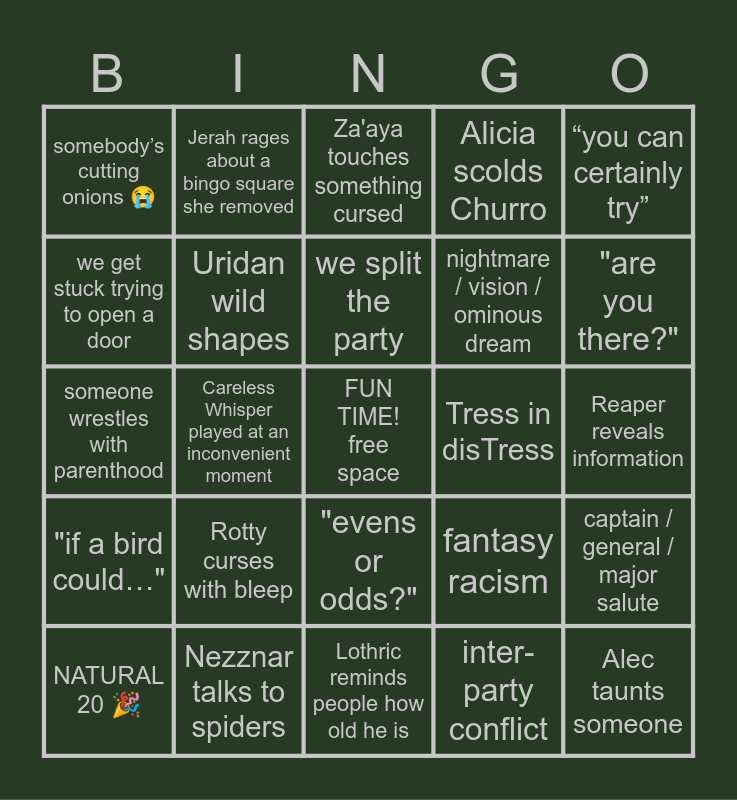 This bingo card has a free space and 29 words: NATURAL 20 🎉, critical fail 💀, Careless Whisper played at an inconvenient moment, roll initiative, somebody’s cutting onions 😭, Za'aya touches something cursed, Uridan wild shapes, Rotty curses with bleep, Tress in disTress, Nezznar talks to spiders, Reaper reveals information, Alec taunts someone, Lothric reminds people how old he is, inter-party conflict, "are you there?", “this session is brought to you by…”, "evens or odds?", "if a bird could…", “you can certainly try”, someone wrestles with parenthood, fantasy racism, halfling luck, nightmare / vision / ominous dream, we get stuck trying to open a door, Alicia scolds Churro, Jerah rages about a bingo square she removed, captain / general / major salute, we split the party and pet cam!.