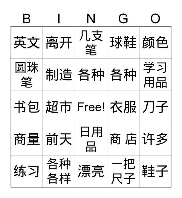 This bingo card has a free space and 25 words: 前天, 漂亮, 各种, 练习, 颜色, 英文, 圆珠笔, 离开, 衣服, 日用品, 各种, 书包, 商 店, 许多, 制造, 练习本, 刀子, 几支笔, 学习用品, 超市, 鞋子, 各种各样, 商量, 球鞋 and 一把尺子.