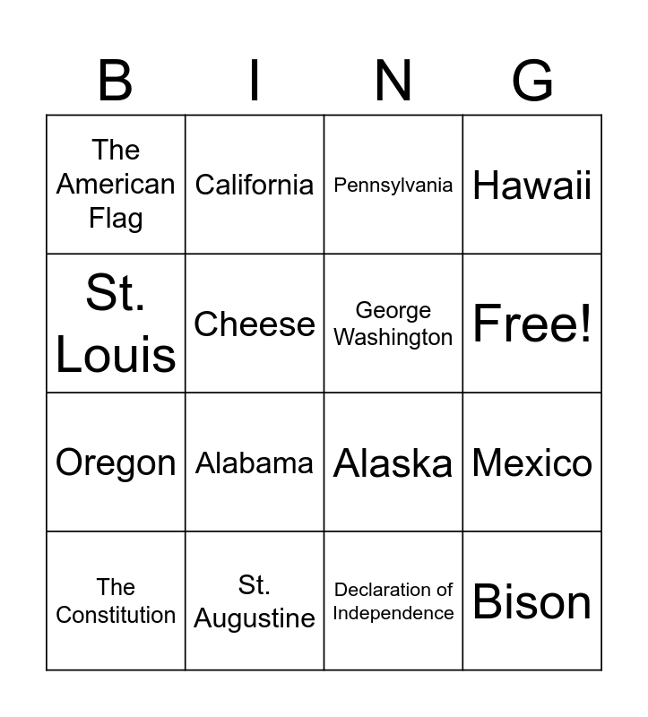 This bingo card has 17 words: Declaration of Independence, The Constitution, Pennsylvania, The American Flag, Alabama, Hawaii, Mexico, George Washington, Free!, Cheese, St. Augustine, Alaska, St. Louis, California, Oregon, Nebraska and Bison.