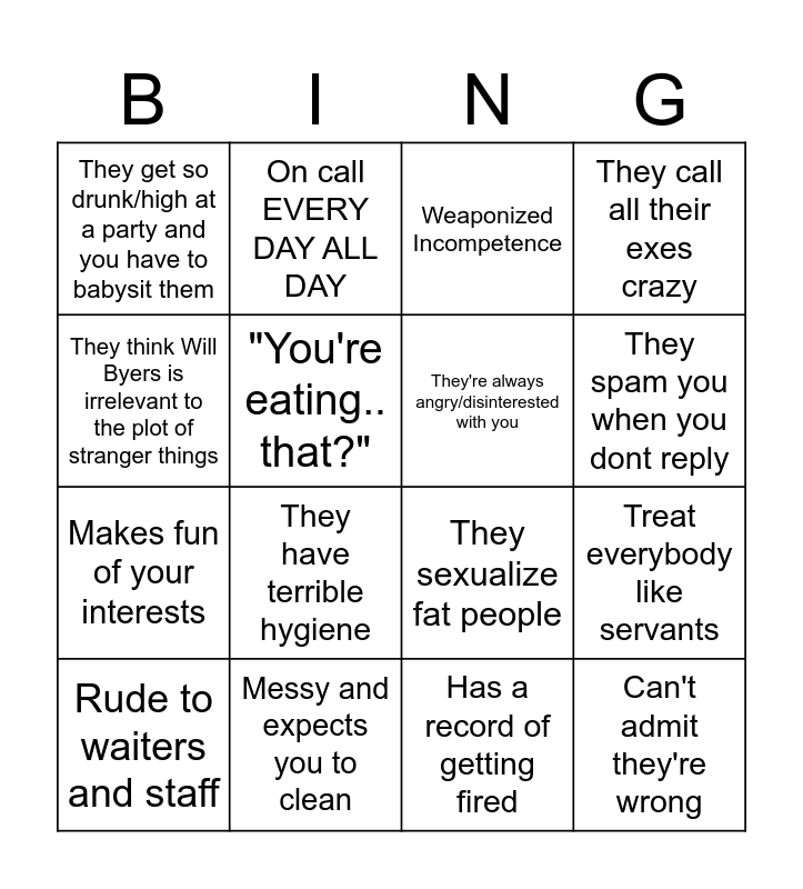 This bingo card has 28 words: Get jealous over nothing, Controls your outfits, Makes fun of your interests, Hates Hunter, "You're eating.. that?", Weaponized Incompetence, On call EVERY DAY ALL DAY, Can't admit they're wrong, Messy and expects you to clean, Call any queer media a fetish, They sexualize fat people, They call all their exes crazy, All of their friends dropped them and everybody leaves them, All their friends are assholes, They have terrible hygiene, Insensitive jokes about your trauma, Refers to themselves as a nice guy/girl, They're always angry/disinterested with you, They spam you when you dont reply, You catch them in tiny lies, They get so drunk/high at a party and you have to babysit them, They antagonize you, Rude to waiters and staff, Treat everybody like servants, Has a record of getting fired, Downplays your emotions and people being mean to you, They think Will Byers is irrelevant to the plot of stranger things and Doesn't respect their female friends or family.