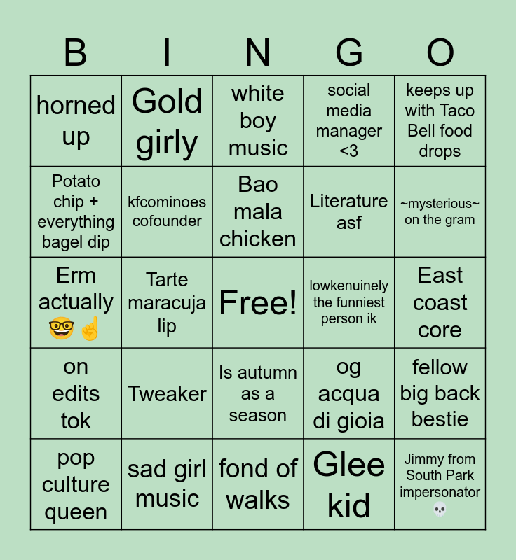 This bingo card has a free space and 24 words: Tweaker, sad girl music, Bao mala chicken, pop culture queen, keeps up with Taco Bell food drops, horned up, Potato chip + everything bagel dip, Gold girly, lowkenuinely the funniest person ik, Is autumn as a season, Literature asf, Erm actually 🤓☝️, og acqua di gioia, fellow big back bestie, kfcominoes cofounder, Glee kid, East coast core, white boy music, ~mysterious~ on the gram, Tarte maracuja lip, Jimmy from South Park impersonator💀, on edits tok, social media manager <3 and fond of walks.