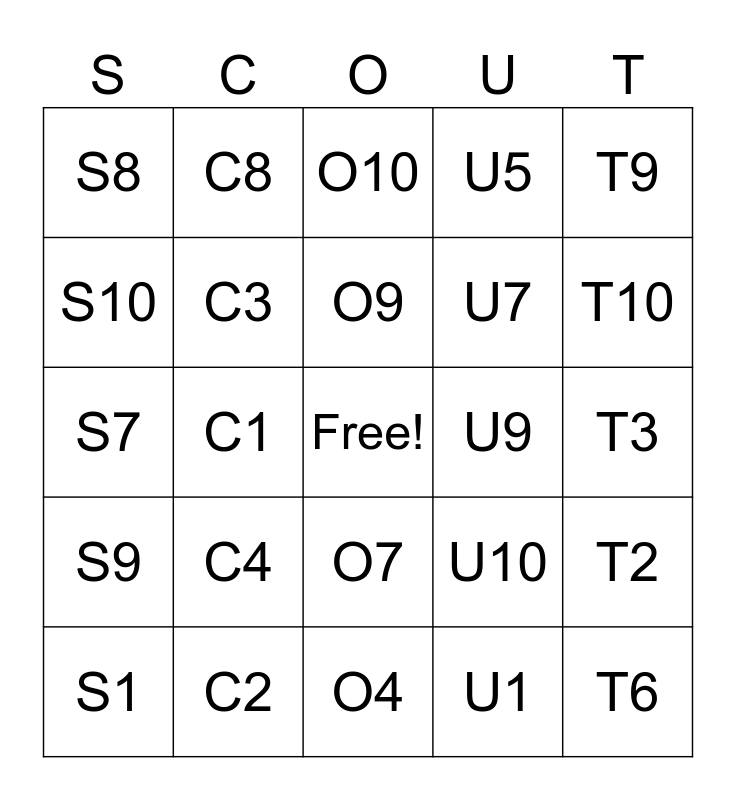 This bingo card has a free space and 24 words: S1, C4, O9, U1, T9, S8, C8, O10, U9, T3, S7, C3, U10, T2, S10, C2, O4, U5, T10, S9, C1, O7, U7 and T6.