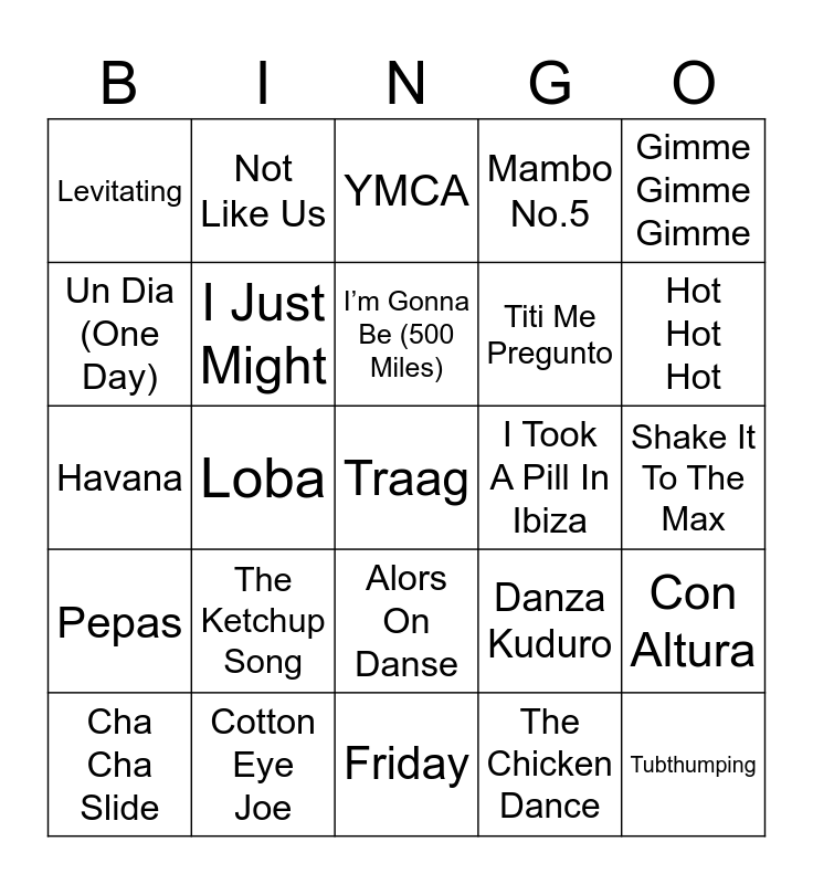 This bingo card has 45 words: Guess, Traag, Suavemente, Cha Cha Slide, Calabria 2008, The Chicken Dance, YMCA, Hips Don’t Lie, Gimme Gimme Gimme, Cotton Eye Joe, Mambo No.5, I Took A Pill In Ibiza, Alors On Danse, The Ketchup Song, Born Again, Friday, Hot To Go!, Havana, Macarena, Hot Hot Hot, Not Like Us, Knock Knock, Tusa, Levitating, Dance Monkey, Shake It To The Max, NUEVAYol, Gasolina, Danza Kuduro, Pepas, LALA, Con Altura, I Like It, Calma, Mi Gente, Loba, Crazy Rap, Tears, Tubthumping, I’m Gonna Be (500 Miles), Un Dia (One Day), Titi Me Pregunto, The Fate of Ophelia, I Just Might and 99 Luftballons.