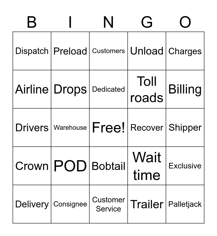 This bingo card has a free space and 29 words: Delivery, Liftgate, Warehouse, Truck, Dispatch, Customers, Drops, POD, Recover, Consignee, Shipper, Palletjack, Customer Service, Trailer, Billing, Special, Bobtail, Crown, Charges, Drivers, Wait time, CFS, Toll roads, Airline, Unload, Preload, Exclusive, Dedicated and Samsara.