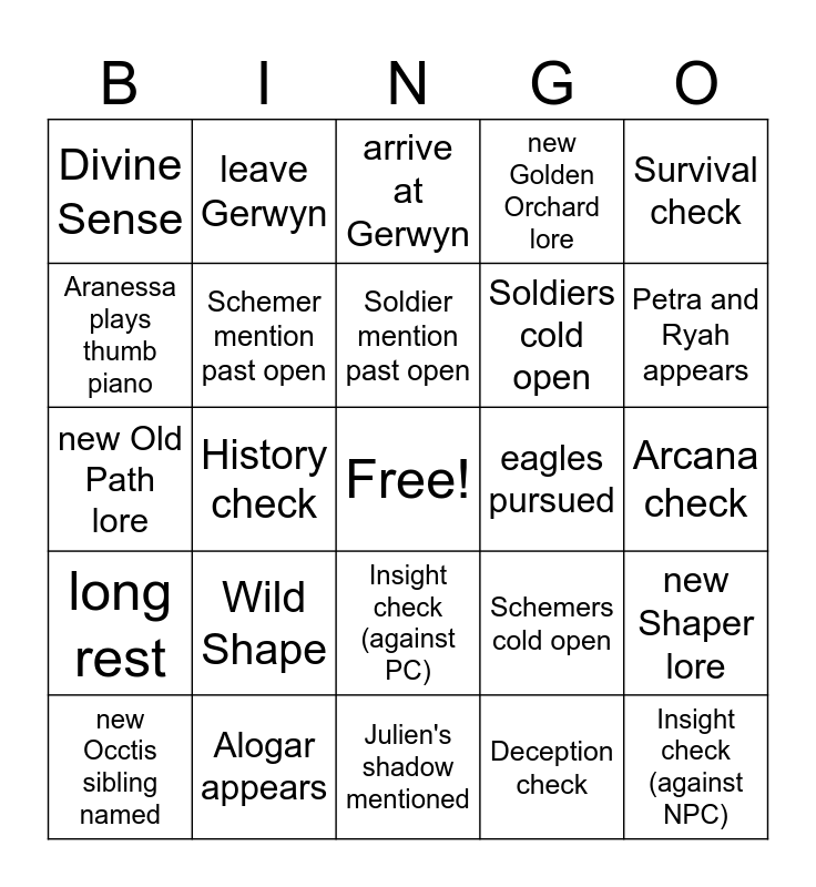 This bingo card has a free space and 27 words: Schemers cold open, Seekers cold open, Soldiers cold open, Julien's shadow mentioned, Aranessa plays thumb piano, arrive at Gerwyn, leave Gerwyn, long rest, eagles pursued, new Shaper lore, new Old Path lore, new Golden Orchard lore, new Occtis sibling named, Alogar appears, Petra and Ryah appears, Maya or Alba mention, Schemer mention past open, Soldier mention past open, Wild Shape, Divine Sense, Arcana check, Deception check, History check, Insight check (against NPC), Insight check (against PC), Survival check and Perception check.