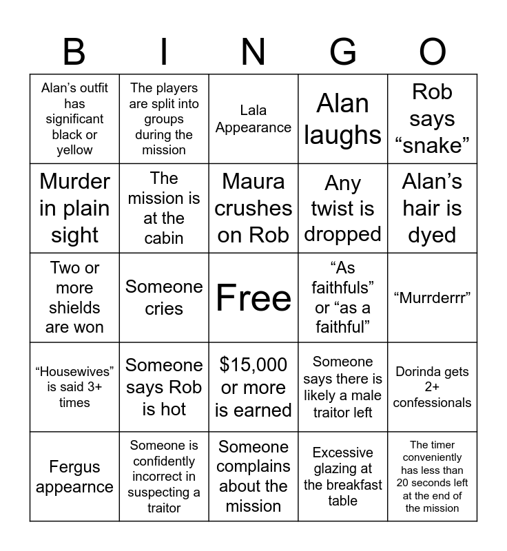 This bingo card has a free space and 29 words: Fergus appearnce, Bugs appear in the mission, Someone cries, A traitor slips up, Alan’s outfit has significant black or yellow, Lala Appearance, The mission is at the cabin, Someone says Rob is hot, “As faithfuls” or “as a faithful”, Someone is confidently incorrect in suspecting a traitor, “Murrderrr”, The timer conveniently has less than 20 seconds left at the end of the mission, Someone complains about the mission, Excessive glazing at the breakfast table, Alan’s hair is dyed, A specific food is mentioned, $15,000 or more is earned, “Housewives” is said 3+ times, Rob says “snake”, Two or more shields are won, Someone says there is likely a male traitor left, Someone suspects a recruitment, Any twist is dropped, Murder in plain sight, Alan laughs, The players are split into groups during the mission, Dorinda gets 2+ confessionals, Maura crushes on Rob and Tara/Johnny mention their friendship with the other.