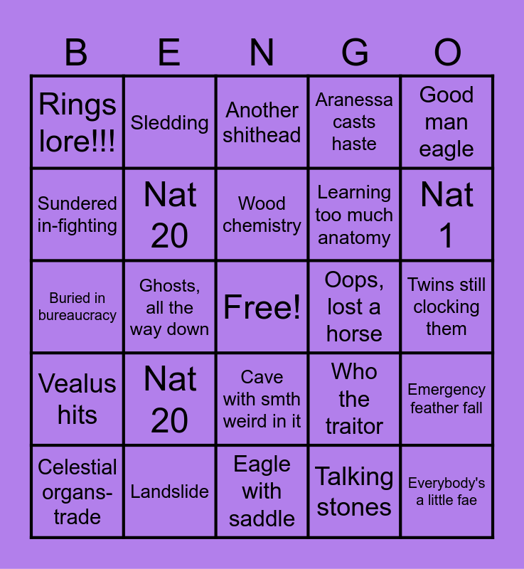This bingo card has a free space and 24 words: Nat 20, Landslide, Wood chemistry, Celestial organs-trade, Good man eagle, Rings lore!!!, Sundered in-fighting, Sledding, Oops, lost a horse, Cave with smth weird in it, Learning too much anatomy, Buried in bureaucracy, Who the traitor, Emergency feather fall, Nat 20, Talking stones, Twins still clocking them, Another shithead, Nat 1, Ghosts, all the way down, Everybody's a little fae, Vealus hits, Aranessa casts haste and Eagle with saddle.