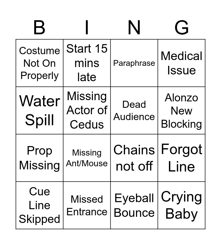 This bingo card has 16 words: Missed Entrance, Forgot Line, Paraphrase, Costume Not On Properly, Prop Missing, Start 15 mins late, Chains not off, Eyeball Bounce, Water Spill, Missing Actor of Cedus, Cue Line Skipped, Medical Issue, Missing Ant/Mouse, Alonzo New Blocking, Dead Audience and Crying Baby.