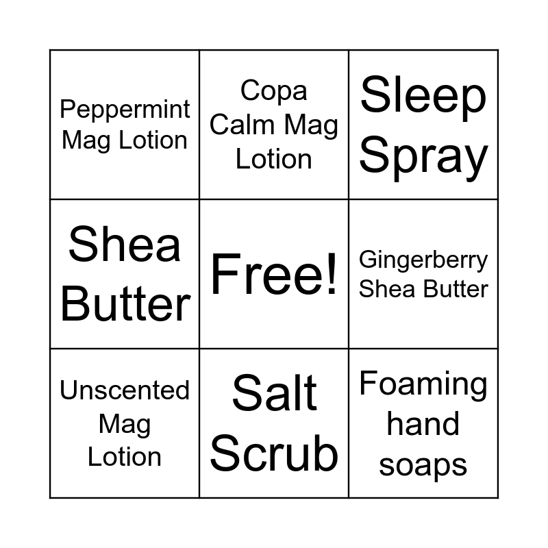 This bingo card has a free space and 8 words: Gingerberry Shea Butter, Sleep Spray, Copa Calm Mag Lotion, Unscented Mag Lotion, Peppermint Mag Lotion, Foaming hand soaps, Shea Butter and Salt Scrub.