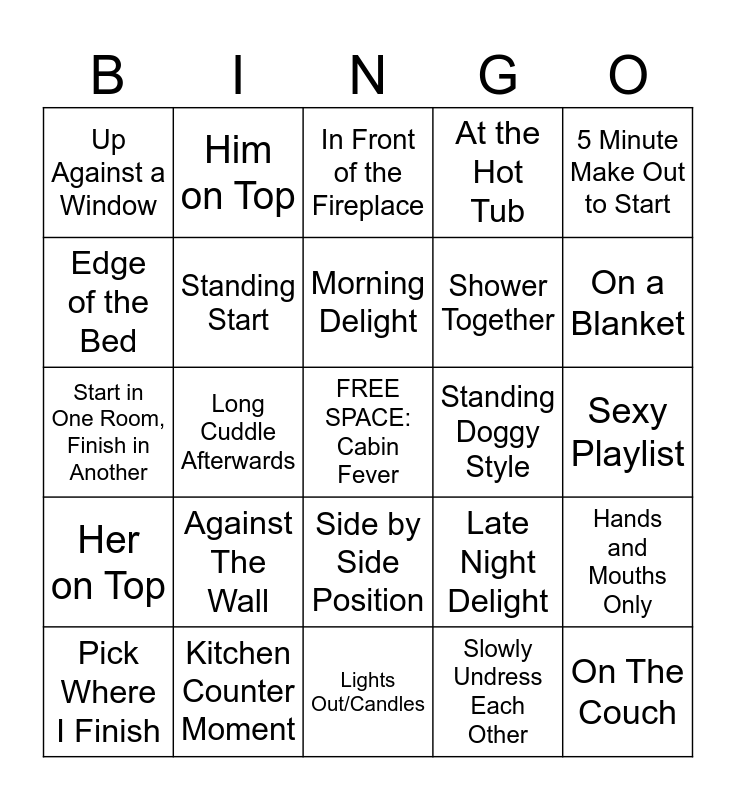This bingo card has a free space and 24 words: Against The Wall, Kitchen Counter Moment, Morning Delight, Pick Where I Finish, 5 Minute Make Out to Start, Up Against a Window, Edge of the Bed, Him on Top, Standing Doggy Style, Side by Side Position, Shower Together, Start in One Room, Finish in Another, Late Night Delight, Hands and Mouths Only, Standing Start, Slowly Undress Each Other, Sexy Playlist, In Front of the Fireplace, On a Blanket, Long Cuddle Afterwards, On The Couch, Her on Top, At the Hot Tub and Lights Out/Candles.