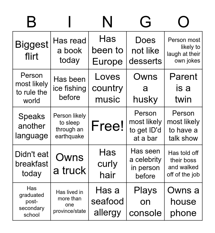 This bingo card has a free space and 24 words: Owns a truck, Has lived in more than one province/state, Loves country music, Has graduated post-secondary school, Person most likely to laugh at their own jokes, Biggest flirt, Person most likely to rule the world, Has read a book today, Person most likely to get ID'd at a bar, Has curly hair, Owns a husky, Speaks another language, Has seen a celebrity in person before, Has told off their boss and walked off of the job, Has been ice fishing before, Plays on console, Person most likely to have a talk show, Has been to Europe, Parent is a twin, Person likely to sleep through an earthquake, Owns a house phone, Didn't eat breakfast today, Does not like desserts and Has a seafood allergy.