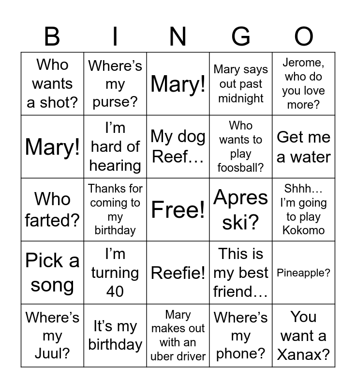 This bingo card has a free space and 24 words: I’m turning 40, It’s my birthday, My dog Reef…, Where’s my Juul?, Jerome, who do you love more?, Who wants a shot?, Mary!, Where’s my purse?, Apres ski?, Reefie!, Who wants to play foosball?, Who farted?, This is my best friend…, Pineapple?, I’m hard of hearing, Where’s my phone?, Shhh… I’m going to play Kokomo, Mary!, Get me a water, Thanks for coming to my birthday, You want a Xanax?, Pick a song, Mary says out past midnight and Mary makes out with an uber driver.