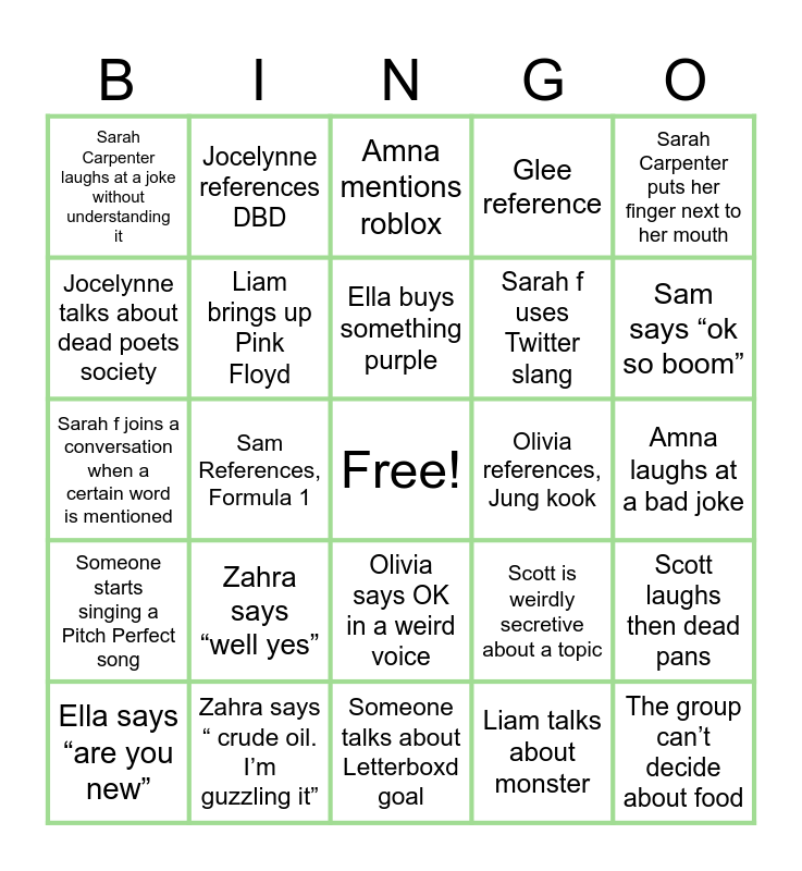 This bingo card has a free space and 24 words: Zahra says “well yes”, Zahra says “ crude oil. I’m guzzling it”, Ella buys something purple, Ella says “are you new”, Sarah Carpenter puts her finger next to her mouth, Sarah Carpenter laughs at a joke without understanding it, Jocelynne talks about dead poets society, Jocelynne references DBD, Olivia references, Jung kook, Olivia says OK in a weird voice, Sarah f uses Twitter slang, Sarah f joins a conversation when a certain word is mentioned, Scott is weirdly secretive about a topic, Scott laughs then dead pans, Liam brings up Pink Floyd, Liam talks about monster, Amna laughs at a bad joke, Amna mentions roblox, Sam says “ok so boom”, Sam References, Formula 1, The group can’t decide about food, Someone starts singing a Pitch Perfect song, Glee reference and Someone talks about Letterboxd goal.