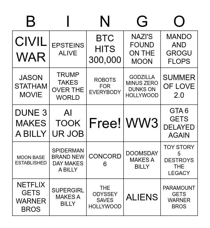 This bingo card has a free space and 24 words: SPIDERMAN BRAND NEW DAY MAKES A BILLY, SUPERGIRL MAKES A BILLY, ROBOTS FOR EVERYBODY, NETFLIX GETS WARNER BROS, MANDO AND GROGU FLOPS, CIVIL WAR, JASON STATHAM MOVIE, EPSTEINS ALIVE, WW3, CONCORD 6, GODZILLA MINUS ZERO DUNKS ON HOLLYWOOD, DUNE 3 MAKES A BILLY, DOOMSDAY MAKES A BILLY, TOY STORY 5 DESTROYS THE LEGACY, TRUMP TAKES OVER THE WORLD, ALIENS, GTA 6 GETS DELAYED AGAIN, BTC HITS 300,000, SUMMER OF LOVE 2.0, AI TOOK UR JOB, PARAMOUNT GETS WARNER BROS, MOON BASE ESTABLISHED, NAZI'S FOUND ON THE MOON and THE ODYSSEY SAVES HOLLYWOOD.