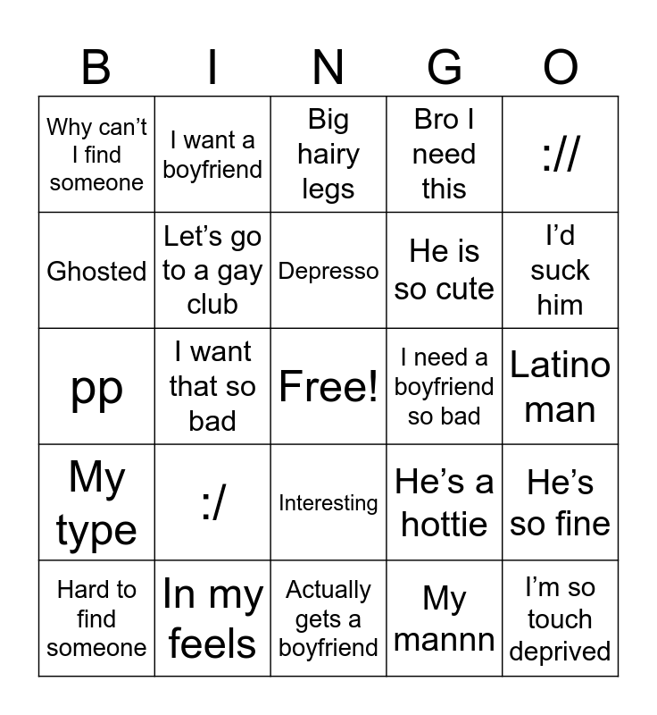 This bingo card has a free space and 24 words: :/, In my feels, Depresso, Hard to find someone, ://, Why can’t I find someone, Ghosted, I want a boyfriend, I need a boyfriend so bad, Interesting, He is so cute, pp, He’s a hottie, He’s so fine, Let’s go to a gay club, My mannn, Latino man, Big hairy legs, I’d suck him, I want that so bad, I’m so touch deprived, My type, Bro I need this and Actually gets a boyfriend.