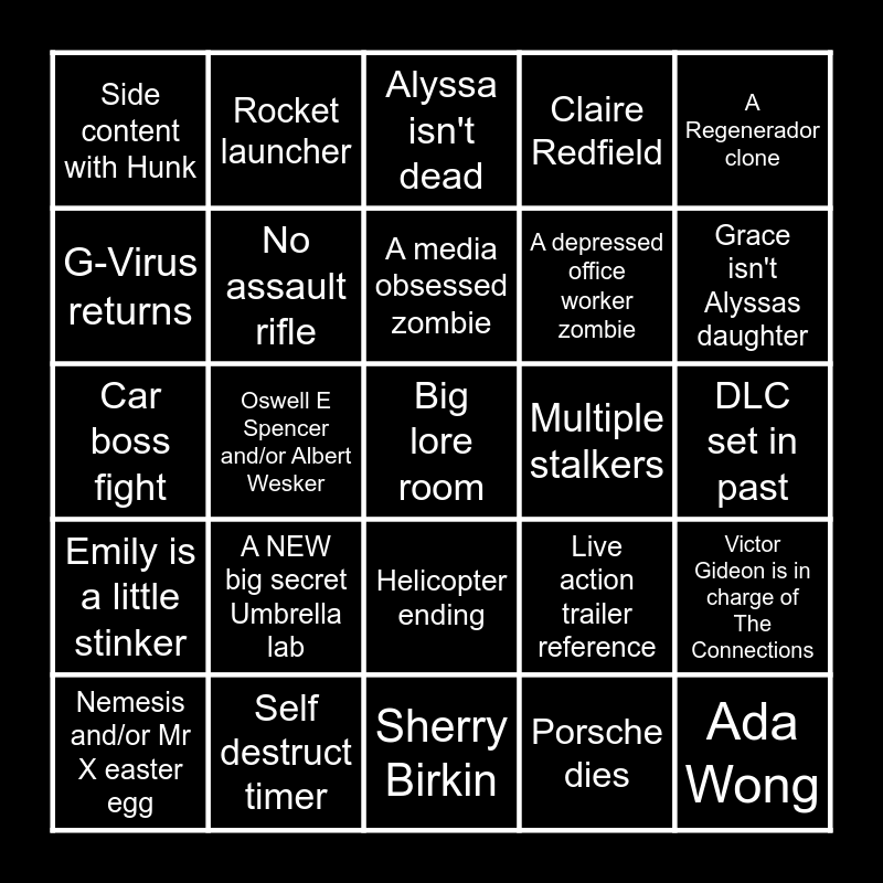 This bingo card has a free space and 24 words: A NEW big secret Umbrella lab, Self destruct timer, A media obsessed zombie, Nemesis and/or Mr X easter egg, A Regenerador clone, Side content with Hunk, G-Virus returns, Rocket launcher, Multiple stalkers, Helicopter ending, A depressed office worker zombie, Car boss fight, Live action trailer reference, Victor Gideon is in charge of The Connections, No assault rifle, Porsche dies, DLC set in past, Alyssa isn't dead, Grace isn't Alyssas daughter, Oswell E Spencer and/or Albert Wesker, Ada Wong, Emily is a little stinker, Claire Redfield and Sherry Birkin.