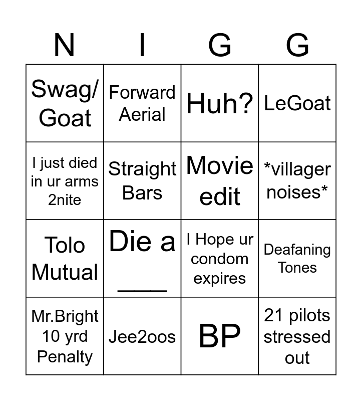 This bingo card has 20 words: Deafaning Tones, A leap of faith, Huh?, Hermana, Mr.Bright 10 yrd Penalty, I just died in ur arms 2nite, Jee2oos, Swag/ Goat, Tolo Mutual, Forward Aerial, Die a ___, I Hope ur condom expires, Straight Bars, 21 pilots stressed out, Movie edit, Stay with me now, *villager noises*, LeGoat, BP and 0-7.