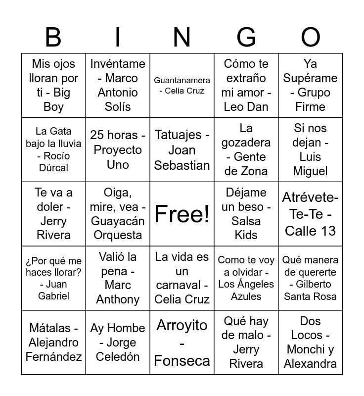 This bingo card has a free space and 64 words: El chico del Apartamento 512 - Selena, La bilirrubina - Juan Luis Guerra, Llorarás - Oscar de León, Qué manera de quererte - Gilberto Santa Rosa, Mi Talismán - Ana Gabriel, Naila - Bronco, Invéntame - Marco Antonio Solís, Ni contigo ni sin ti - Pepe Aguilar, Tatuajes - Joan Sebastian, El listón de tu pelo - Los Ángeles Azules, La vida es un carnaval - Celia Cruz, La Ciguapa - Chichi Peralta, Atrévete-Te-Te - Calle 13, Ya Supérame - Grupo Firme, Por mi no te detengas - Banda MS, La Gata bajo la lluvia - Rocío Dúrcal, Oiga, mire, vea - Guayacán Orquesta, Mis ojos lloran por ti - Big Boy, Ciega, sordomuda - Shakira, La gozadera - Gente de Zona, Valió la pena - Marc Anthony, ¿Por qué me haces llorar? - Juan Gabriel, Cómo te extraño mi amor - Leo Dan, Lamento Boliviano - Los Enanitos Verdes, Lo que pasó, pasó - Daddy Yankee, Tu eres ajena - Eddy Herrera, Mi mujer me gobierna - La Banda Gorda, Si me dejas no vale - La Linea, Voy a conquistarte - Diego Verdaguer, El rey - Vicente Fernández, La puerta negra - Los Tigres del Norte, Te solté la rienda - José Alfredo Jiménez, Oye mi amor - Maná, Ahora te puedes marchar - Luis Miguel, Si nos dejan - Luis Miguel, Mátalas - Alejandro Fernández, Cali Pachanguero - Grupo Niche, Qué hay de malo - Jerry Rivera, Propuesta indecente - Romeo Santos, 25 horas - Proyecto Uno, Te va a doler - Jerry Rivera, Déjame un beso - Salsa Kids, Burbujas de amor - Juan Luis Guerra, Yo no sé mañana - Luis Enrique, Tú me vuelves loco - Frankie Ruiz, Dos Locos - Monchi y Alexandra, Ay Hombe - Jorge Celedón, Se me perdió la cadenita - La Sonora Dinamita, Como te voy a olvidar - Los Ángeles Azules, Tití me preguntó - Bad Bunny, Provenza - Karol G, Sabes a chocolate - Kumbia Kings, Arroyito - Fonseca, Carito - Carlos Vives, Mal Bicho - Los Fabulosos Cadillacs, Saca, prende y sorprende - Cultura Profética, Guantanamera - Celia Cruz, Otro día sin verte - Jon Secada, Otra como tú - Eros Ramazzotti, Rosa Pastel - Belanova, La calle de las sirenas - Kabah, Shabadabada - OV7, Si el norte fuera el sur - Ricardo Arjona and Calipso - Luis Fonsi.