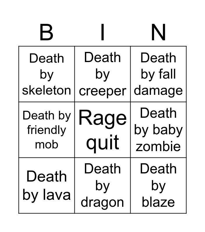 This bingo card has a free space and 8 words: Death by baby zombie, Death by fall damage, Death by creeper, Death by lava, Death by skeleton, Death by blaze, Death by friendly mob and Death by dragon.