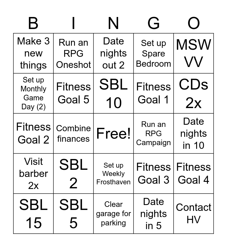 This bingo card has a free space and 24 words: SBL 2, SBL 5, SBL 10, SBL 15, MSW VV, Make 3 new things, Set up Monthly Game Day (2), Run an RPG Oneshot, Run an RPG Campaign, Set up Weekly Frosthaven, Fitness Goal 1, Fitness Goal 2, Fitness Goal 3, Fitness Goal 4, Fitness Goal 5, Date nights in 5, Date nights in 10, Date nights out 2, CDs 2x, Combine finances, Contact HV, Visit barber 2x, Set up Spare Bedroom and Clear garage for parking.