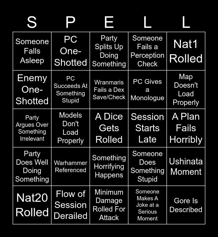 This bingo card has a free space and 24 words: Warhammer Referenced, Flow of Session Derailed, Wranmaris Fails a Dex Save/Check, Nat20 Rolled, Nat1 Rolled, Someone Falls Asleep, Enemy One-Shotted, PC One-Shotted, Session Starts Late, Something Horrifying Happens, PC Gives a Monologue, Party Argues Over Something Irrelevant, Someone Does Something Stupid, Ushinata Moment, PC Succeeds At Something Stupid, Someone Makes A Joke at a Serious Moment, A Plan Fails Horribly, Party Splits Up Doing Something, Map Doesn't Load Properly, Models Don't Load Properly, Gore Is Described, Party Does Well Doing Something, Someone Fails a Perception Check and Minimum Damage Rolled For Attack.