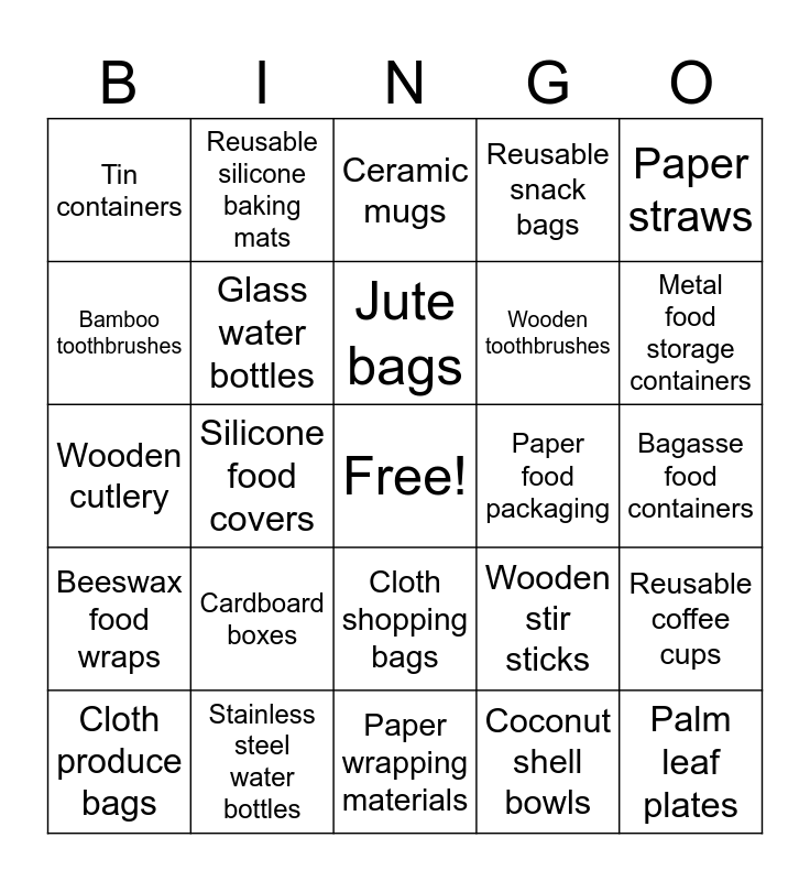 This bingo card has a free space and 40 words: Bamboo utensils, Wooden cutlery, Stainless steel straws, Glass water bottles, Stainless steel water bottles, Cloth shopping bags, Jute bags, Canvas tote bags, Paper straws, Beeswax food wraps, Silicone food covers, Reusable snack bags, Palm leaf plates, Bagasse food containers, Paper food packaging, Cardboard boxes, Glass jars, Tin containers, Metal lunch boxes, Ceramic mugs, Reusable coffee cups, Coconut shell bowls, Wooden toothbrushes, Bamboo toothbrushes, Refillable soap dispensers, Refillable shampoo bottles, Compostable cutlery, Bioplastic packaging, Mushroom-based packaging, Seaweed-based packaging, Paper mailing envelopes, Cloth produce bags, Reusable takeout containers, Wooden stir sticks, Metal food storage containers, Paper wrapping materials, Cork packaging, Natural fiber ropes, Reusable silicone baking mats and Wax-coated paper packaging.
