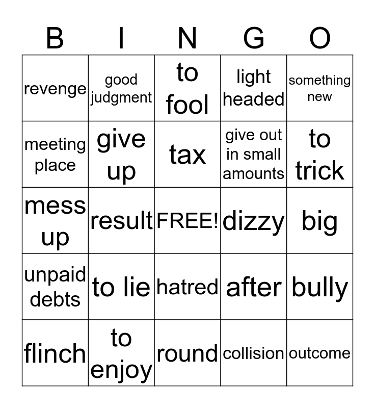 This bingo card has a free space and 24 words: to lie, to enjoy, tax, flinch, something new, revenge, meeting place, good judgment, dizzy, hatred, give out in small amounts, mess up, after, bully, give up, collision, big, to fool, to trick, result, outcome, unpaid debts, light headed and round.