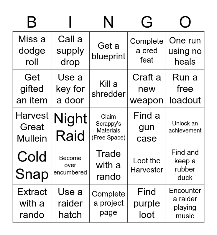 This bingo card has a free space and 29 words: Extract with a rando, Kill a large arc, Night Raid, 3 Star a trial, Miss a dodge roll, Get a blueprint, Use a key for a door, Become over encumbered, Find a gun case, Use a raider hatch, Unlock an achievement, Encounter a raider playing music, Complete a project page, Find purple loot, Run a free loadout, Defib someone, Trade with a rando, Cold Snap, One run using no heals, Harvest Great Mullein, Loot the Harvester, Find a door key for another map, Craft a new weapon, Get gifted an item, Complete a cred feat, Call a supply drop, Find and keep a rubber duck, Kill a shredder and Use a wolfpack.