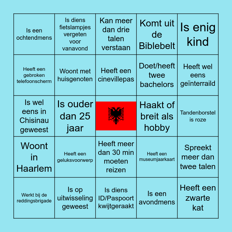 This bingo card has a free space and 50 words: Heeft wel eens een bot gebroken, Heeft een zwarte kat, Gelooft in sterrenbeelden, Is diens ID/Paspoort kwijtgeraakt, Heeft een geluksvoorwerp, Heeft de afgelopen maand een platte band gehad, Is diens fietslampjes vergeten voor vanavond, Heeft een geluksgetal, Heeft een gebroken telefoonscherm, Heeft een partner, Woont met huisgenoten, Komt uit de Biblebelt, Spreekt meer dan twee talen, Heeft een museumjaarkaart, Lievelingskleur is blauw, Studeert geen geschiedenis, Heeft een cinevillepas, Haakt of breit als hobby, Kijkt Wie is de mol, Is enig kind, Is ouder dan 25 jaar, Is een avondmens, Is een ochtendmens, Doet/heeft twee bachelors, Doet twee masters, Is fan van Dua Lipa, Heeft wel eens geïnterraild, Is vegetariër, Kan meer dan drie talen verstaan, Heeft meer dan 30 min moeten reizen, Heeft gister voor zichzelf gekookt, Woont bij ouders, Kan gitaar spelen, Gaat met de fiets naar uni, Is op uitwisseling geweest, Leest 50+ boeken per jaar, Speelt tennis, Volgt een cursus bij Crea, Zit bij een studievereniging, Tandenborstel is roze, Heeft komende week een deadline, Heeft meer dan 3, broers/zussen, Zit in een orkest/koor, Werkt bij de reddingsbrigade, Is wel eens in Chisinau geweest, Is al eens in de landen geweest, Heeft 15 of meer landen in Europa bezocht, Woont in Haarlem and Was deze maand in Parijs.