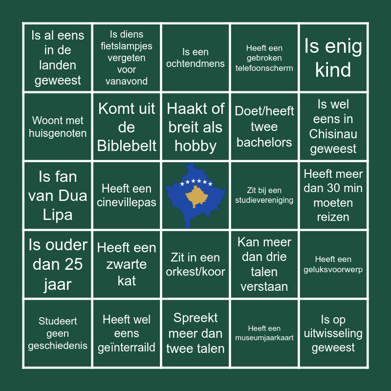 This bingo card has a free space and 49 words: Heeft wel eens een bot gebroken, Heeft een zwarte kat, Gelooft in sterrenbeelden, Is diens ID/Paspoort kwijtgeraakt, Heeft een geluksvoorwerp, Heeft de afgelopen maand een platte band gehad, Is diens fietslampjes vergeten voor vanavond, Heeft een geluksgetal, Heeft een gebroken telefoonscherm, Heeft een partner, Woont met huisgenoten, Komt uit de Biblebelt, Spreekt meer dan twee talen, Heeft een museumjaarkaart, Lievelingskleur is blauw, Studeert geen geschiedenis, Heeft een cinevillepas, Haakt of breit als hobby, Kijkt Wie is de mol, Is enig kind, Is ouder dan 25 jaar, Is een avondmens, Is een ochtendmens, Doet/heeft twee bachelors, Doet twee masters, Is fan van Dua Lipa, Heeft wel eens geïnterraild, Is vegetariër, Kan meer dan drie talen verstaan, Heeft meer dan 30 min moeten reizen, Heeft gister voor zichzelf gekookt, Woont bij ouders, Kan gitaar spelen, Gaat met de fiets naar uni, Is op uitwisseling geweest, Leest 50+ boeken per jaar, Speelt tennis, Volgt een cursus bij Crea, Zit bij een studievereniging, Tandenborstel is roze, Heeft komende week een deadline, Heeft meer dan 3 broers/zussen, Zit in een orkest/koor, Werkt bij de reddingsbrigade, Is wel eens in Chisinau geweest, Is al eens in de landen geweest, Heeft 15 of meer landen in Europa bezocht, Woont in Haarlem and Was deze maand in Parijs.