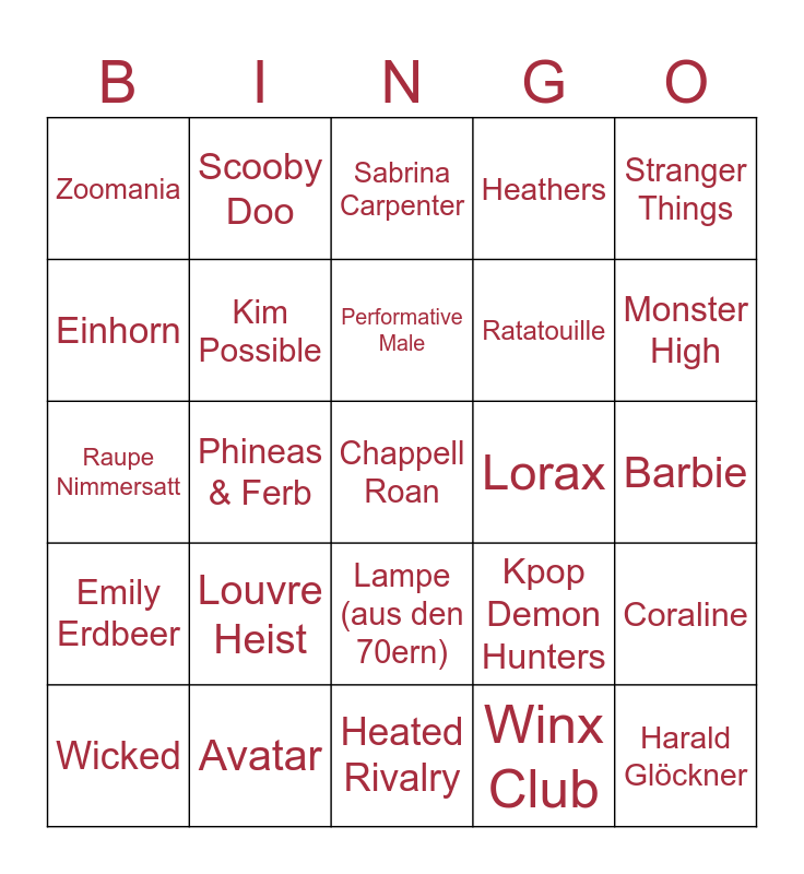 This bingo card has a free space and 24 words: Louvre Heist, Avatar, Performative Male, Wicked, Stranger Things, Zoomania, Einhorn, Scooby Doo, Lorax, Lampe (aus den 70ern), Ratatouille, Raupe Nimmersatt, Kpop Demon Hunters, Coraline, Kim Possible, Winx Club, Barbie, Sabrina Carpenter, Monster High, Phineas & Ferb, Harald Glöckner, Emily Erdbeer, Heathers and Heated Rivalry.