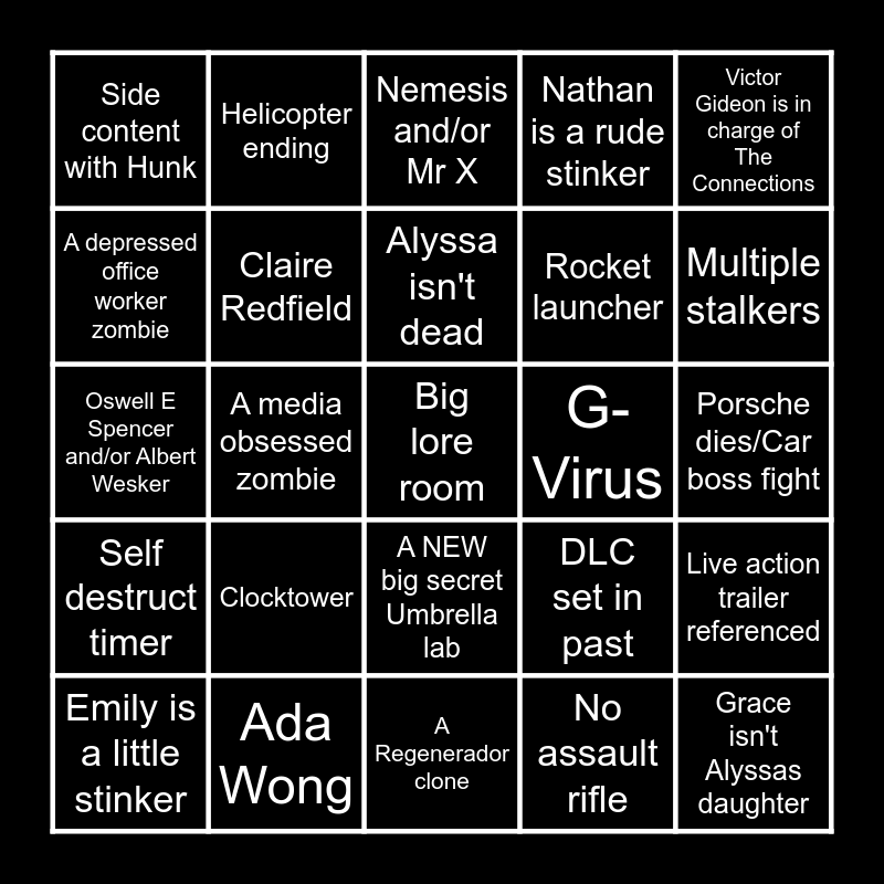 This bingo card has a free space and 24 words: Clocktower, Ada Wong, Alyssa isn't dead, Emily is a little stinker, Victor Gideon is in charge of The Connections, Side content with Hunk, A depressed office worker zombie, Helicopter ending, G-Virus, A NEW big secret Umbrella lab, Rocket launcher, Oswell E Spencer and/or Albert Wesker, DLC set in past, Live action trailer referenced, Claire Redfield, No assault rifle, Porsche dies/Car boss fight, Nemesis and/or Mr X, Multiple stalkers, A media obsessed zombie, Grace isn't Alyssas daughter, Self destruct timer, Nathan is a rude stinker and A Regenerador clone.