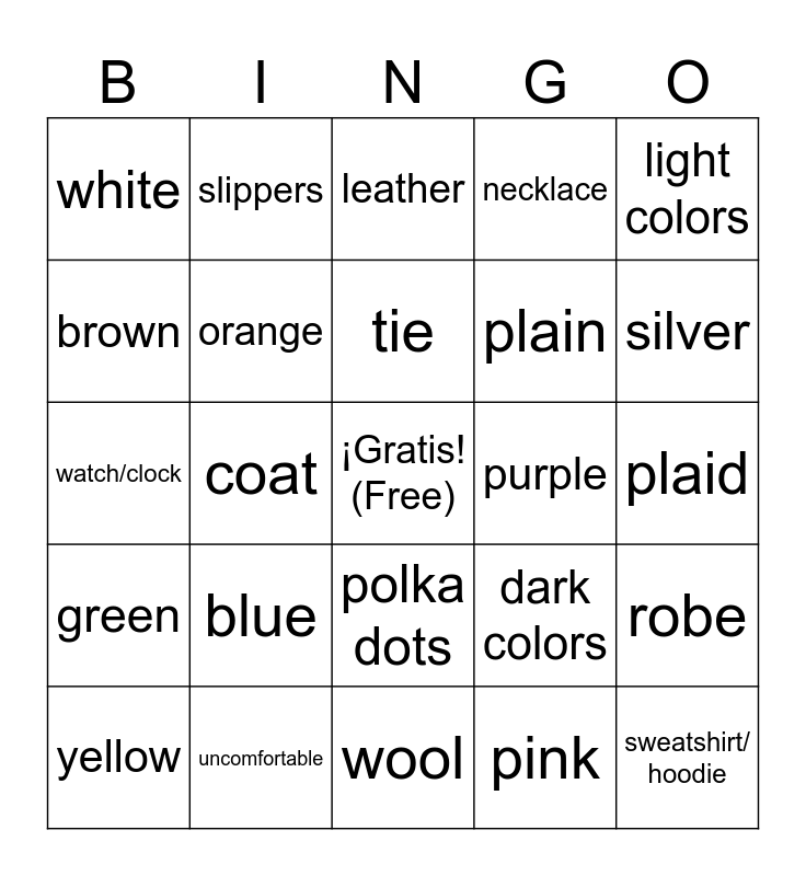 This bingo card has a free space and 29 words: yellow, comfortable, coat, cotton, white, leather, orange, blue, purple, uncomfortable, plaid, sweatshirt/ hoodie, wool, pink, silver, stripes, polka dots, green, light colors, watch/clock, dark colors, gold, plain, brown, necklace, slippers, robe, tie and swimsuit.