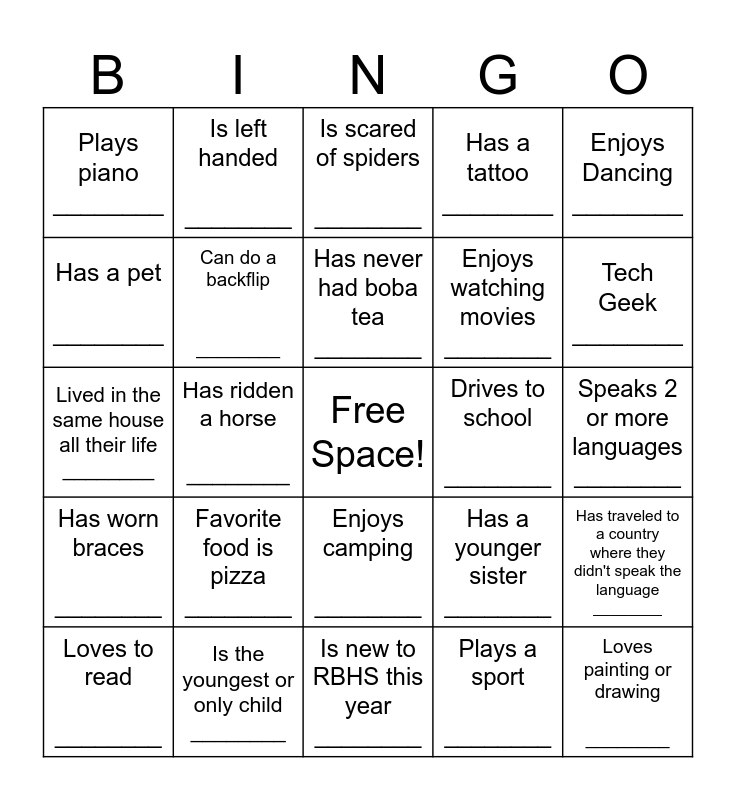 This bingo card has a free space and 24 words: Favorite food is pizza ________, Is the youngest or only child ________, Has never had boba tea ________, Loves to read ________, Enjoys Dancing ________, Plays piano ________, Has a pet ________, Is left handed ________, Drives to school ________, Enjoys camping ________, Enjoys watching movies ________, Lived in the same house all their life ________, Has a younger sister ________, Has traveled to a country where they didn't speak the language ________, Can do a backflip ________, Plays a sport ________, Speaks 2 or more languages ________, Is scared of spiders ________, Tech Geek ________, Has ridden a horse ________, Loves painting or drawing ________, Has worn braces ________, Has a tattoo ________ and Is new to RBHS this year ________.
