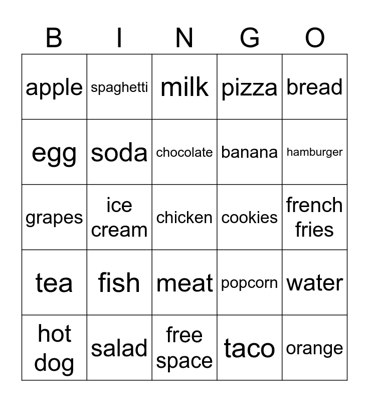 This bingo card has 25 words: tea, salad, chicken, taco, bread, apple, spaghetti, milk, cookies, water, egg, soda, free space, popcorn, hamburger, hot dog, ice cream, chocolate, banana, french fries, grapes, fish, meat, pizza and orange.
