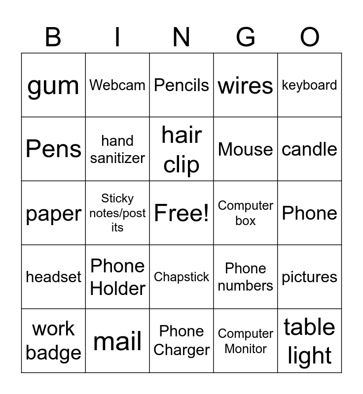 This bingo card has a free space and 24 words: Phone Holder, mail, hair clip, work badge, keyboard, gum, Pens, Webcam, Computer box, Chapstick, Mouse, paper, Phone numbers, pictures, hand sanitizer, Computer Monitor, Phone, Pencils, candle, Sticky notes/post its, table light, headset, wires and Phone Charger.