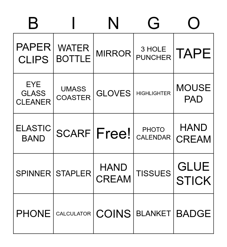 This bingo card has a free space and 24 words: STAPLER, CALCULATOR, GLOVES, PHONE, TAPE, PAPER CLIPS, EYE GLASS CLEANER, WATER BOTTLE, PHOTO CALENDAR, HAND CREAM, HIGHLIGHTER, ELASTIC BAND, TISSUES, GLUE STICK, UMASS COASTER, BLANKET, HAND CREAM, MIRROR, MOUSE PAD, SCARF, BADGE, SPINNER, 3 HOLE PUNCHER and COINS.