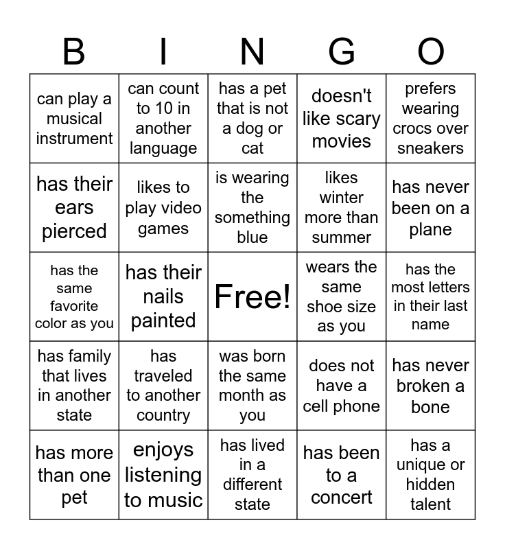 This bingo card has a free space and 25 words: has traveled to another country, has lived in a different state, is wearing the something blue, has more than one pet, prefers wearing crocs over sneakers, can play a musical instrument, has their ears pierced, can count to 10 in another language, wears the same shoe size as you, was born the same month as you, likes winter more than summer, has the same favorite color as you, does not have a cell phone, has never broken a bone, likes to play video games, has played a team sport, has the most letters in their last name, has a pet that is not a dog or cat, has never been on a plane, has their nails painted, has a unique or hidden talent, enjoys listening to music, has family that lives in another state, doesn't like scary movies and has been to a concert.