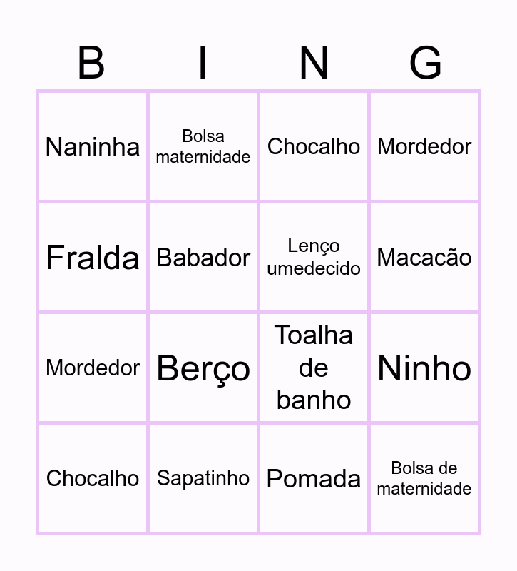 This bingo card has 72 words: Body, Babador, Pomada, Cobertor, Mamadeira, Toalha, Lenço umedecido, Termômetro, Fralda, Meia, Chupeta, Manta, Mordedor, Bolsa maternidade, Carrinho, Macacão, Banheira, Berço, Shampoo, Chocalho, Sapatinho, Banheira, Fralda de boca, Colonia, Meia, Mordedor, Chupeta, Ninho, Trocador, Macacão, Fralda, Mamadeira, Macacão, Babador, Lenço umedecido, Pomada, Manta, Sapatinho, Toalha de banho, Cobertor, Escova de cabelo, Termômetro, Ursinho, Pratinho, Tesourinha, Bolsa de maternidade, Sabonete líquido, Shampoo, Kit higiene, Luvinha, Touquinha, Travesseirinho, Almofada de amamentar, Ninho, Lençol de berço, Babá eletrônica, Chocalho, Mordedor, Cueiro, Canguru, Banheira, Meia, Carrinho, Berço, Moisés, Cadeirinha, Naninha, Cotonete, Escovinha de mamadeira, Talco, Trocador and Bolsa térmica.
