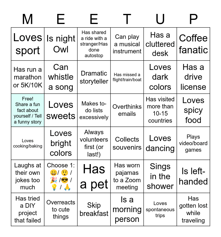 This bingo card has 36 words: Has worn pajamas to a Zoom meeting, Has a pet, Is a morning person, Has run a marathon or 5K/10K, Loves cooking/baking, Overthinks emails, Can whistle a song, Skip breakfast, Has a cluttered desk, Sings in the shower, Has a drive license, Can play a musical instrument, Is left-handed, Loves sweets, Has missed a flight/train/boat, Loves sport, Laughs at their own jokes too much, Has visited more than 10-15 countries, Free! Share a fun fact about yourself / Tell a funny story, Has shared a ride with a stranger/Has done autostop, Makes to-do lists excessively, Loves bright colors, Collects souvenirs, Always volunteers first (or last!), Loves dancing, Is night Owl, Loves dark colors, Overreacts to cute things, Dramatic storyteller, Coffee fanatic, Has gotten lost while traveling, Has tried a DIY project that failed, Plays video/board games, Loves spicy food, Choose 1: 😄/ 😲 / 🎉 /😎 /💡 / 🙏 and Loves spontaneous trips.