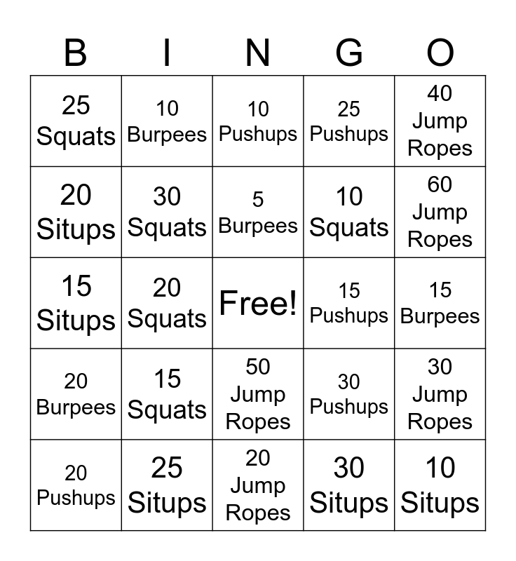 This bingo card has a free space and 24 words: 15 Squats, 25 Situps, 5 Burpees, 20 Pushups, 40 Jump Ropes, 25 Squats, 20 Situps, 10 Burpees, 15 Pushups, 50 Jump Ropes, 10 Squats, 15 Situps, 30 Pushups, 30 Jump Ropes, 30 Squats, 30 Situps, 15 Burpees, 10 Pushups, 60 Jump Ropes, 20 Squats, 10 Situps, 20 Burpees, 25 Pushups and 20 Jump Ropes.
