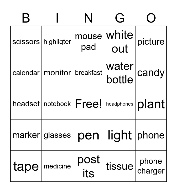 This bingo card has a free space and 24 words: glasses, medicine, breakfast, tape, picture, scissors, calendar, highligter, headphones, pen, water bottle, headset, light, phone, monitor, tissue, plant, mouse pad, candy, notebook, phone charger, marker, white out and post its.