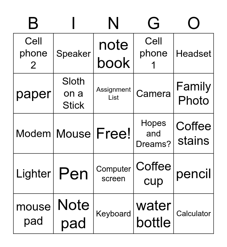 This bingo card has a free space and 24 words: Pen, Note pad, Assignment List, mouse pad, Headset, Cell phone 2, paper, Speaker, Hopes and Dreams?, Computer screen, Camera, Modem, Coffee cup, pencil, Sloth on a Stick, water bottle, Coffee stains, note book, Family Photo, Mouse, Calculator, Lighter, Cell phone 1 and Keyboard.