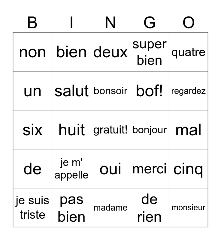 This bingo card has a free space and 24 words: je m' appelle, pas bien, bonsoir, je suis triste, quatre, non, un, bien, bonjour, oui, bof!, six, merci, cinq, salut, de rien, mal, deux, regardez, huit, monsieur, de, super bien and madame.