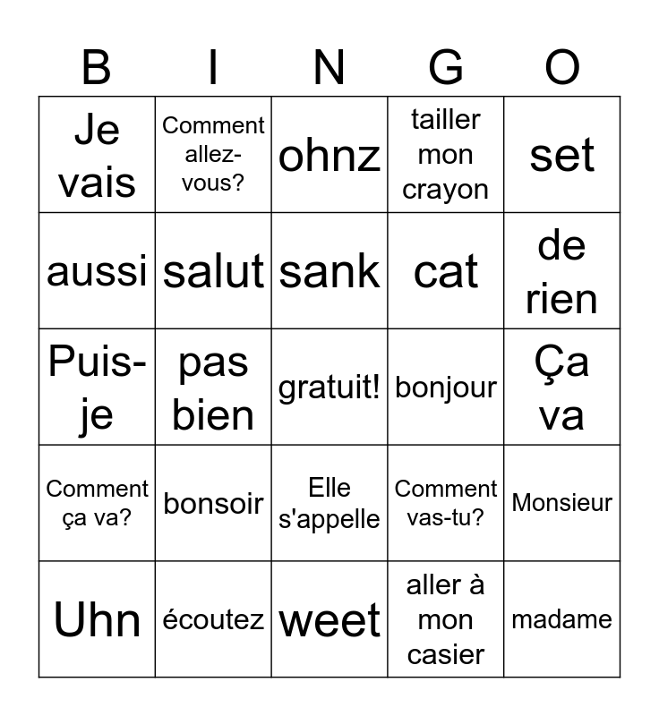 This bingo card has a free space and 24 words: bonsoir, écoutez, sank, Uhn, set, Je vais, aussi, Comment allez-vous?, bonjour, Elle s'appelle, cat, Puis-je, Comment vas-tu?, Monsieur, salut, aller à mon casier, Ça va, ohnz, de rien, pas bien, madame, Comment ça va?, tailler mon crayon and weet.